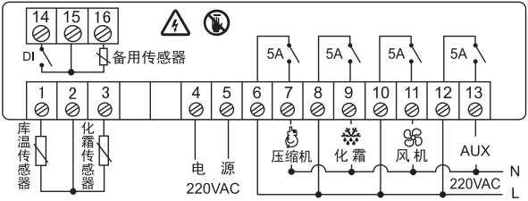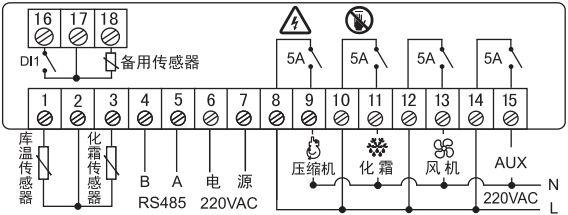 按键说明:在非化霜、非参数设置、非参数查看状态下,化霜周期不为0且化霜传感器温度小于化霜停止温度时, 按住