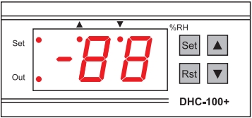 正常显示状态下,当湿度测量值处于湿度设定值和回差之间,或传感器故障时,同时按住 Set 键和Rst键持续3秒以上可以手动切换加湿/除湿输出。