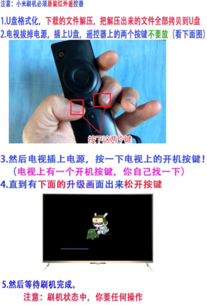小米L32M5-AZ主板固件/主程序,解决不开机、黑屏、死机、停留在开机LOGO界面等故障 发布时间:2023-07-21 作者:admin 文章来源:未知 点击次数: 小米L32M5-AZ主板固件/主程序,解决死机、一直停留在开机LOGO界面、一直停留在广告界面、不进入系统、反复开关机、不开机、黑屏等软件程序故障。只限于解决软件原因导致的故障,可以用本升级方法解决。 下载链接:http://pan.baidu.com/s/1-oaN34HKyXP9EFORZjKh-g?pwd=m829 提取码: m829 复制这段内容后打开百度网盘手机App,操作更方便哦 升级方法: 责任编辑:admin