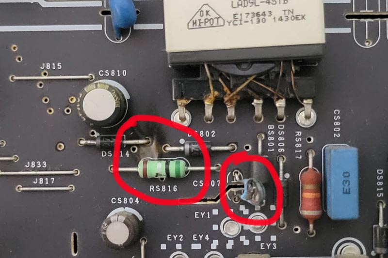 回到维修店里来,拿着强光手电筒照着电路板一点点分析电路走向,花了半个小时终于又测量出好几个元件损坏,位号ICS801C的电源芯片FAN6755的6脚供电对地短路了、短路烧了6脚的位号RS808/100Ω的供电贴片电阻,还有位号RS809、位号RS812、位号RS813的贴片电阻都炸掉了,电阻值也看不到了,只能尝试找一下电路图纸,看能不能找得到这几个炸掉电阻的阻值吧。在百度搜索、各大维修论坛逛了好几遍,就是找不到小米L49M2-AA的电源板图纸。