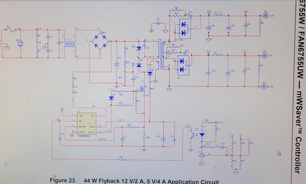 看来得另避蹊径了,既然烧掉的这几个电阻都是电源芯片FAN6755的外围电路,那或许找FAN6755的典型应用电路可以估测出这几个烧掉的电阻的阻值吧。网络上很快就搜索到了FAN6755的官方应用电路,对照着炸掉电阻留下来的残损数字,勉强判断出位号RS809电阻的阻值应该是22Ω、位号RS812电阻的阻值是10kΩ、位号RS813电阻的阻值是100Ω。找来几个型号相同的元件焊上去,希望不要再出意外了。单电源板插上220V电测量输出电压,5V待机电压出来了,给PS_ON 加上个开机电压,12V供电也有输出了。把电源板拿到用户家装上,电视机能正常开机了。