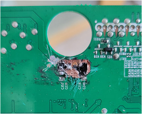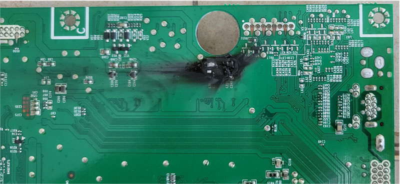 检修一台海信LED42K680X3DU指示灯不亮不开机。先插电试机,插电瞬间电源插头打出了微弱火花,所以判断电源板保险丝肯定没有烧坏,但是按待机键没任何反应。拆机检查,直接测量电源板各输出端口都无任何电压输出,但是电源板大电容有300V主电压。拔掉电源,先看看输出端有没有短路吧,用万用表测量到电源板16V输出端时明显对地短路,拔掉输出到主板的连接线再次测量16V输出端,没有短路了,那说明电源板应该没问题,肯定是主板16V供电端短路了。