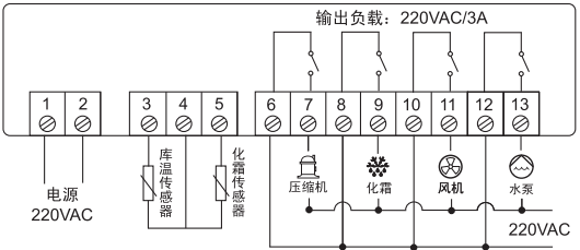 ◇制冷、化霜、风机、水泵输出触点容量:3A/220VAC