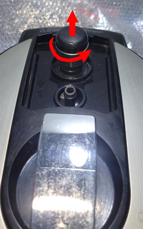 第二步,拆压力阀:压力阀里面是有螺纹的,先用手将压力阀向上提起来,同时逆时针方向转动压力阀,压力阀就直接被拧下来了,如下图: