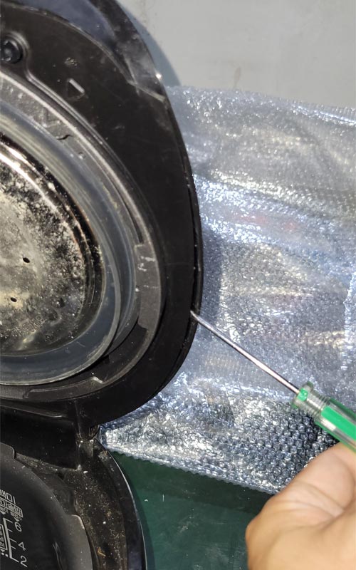 第三步,将压力阀下面的橡胶防尘帽用一字螺丝刀撬起来,如下图: