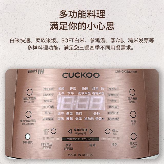 韩国电饭煲没有中文怎么使用各个功能,韩国品牌CUCKOO福库电饭煲CUCHEN酷晨电饭煲按键面板功能中文翻译与对照图片,直接上图:从下述多个图中可以看到,有个规律:按键面板最左边的功能键,左上功能键为“保温/再加热”;左下功能键为“预约”;按键面板最右边的功能键,右上功能键为“压力煮饭/白米快速”,右下功能键为“取消”;其它功能键那就不是统一的位置了。